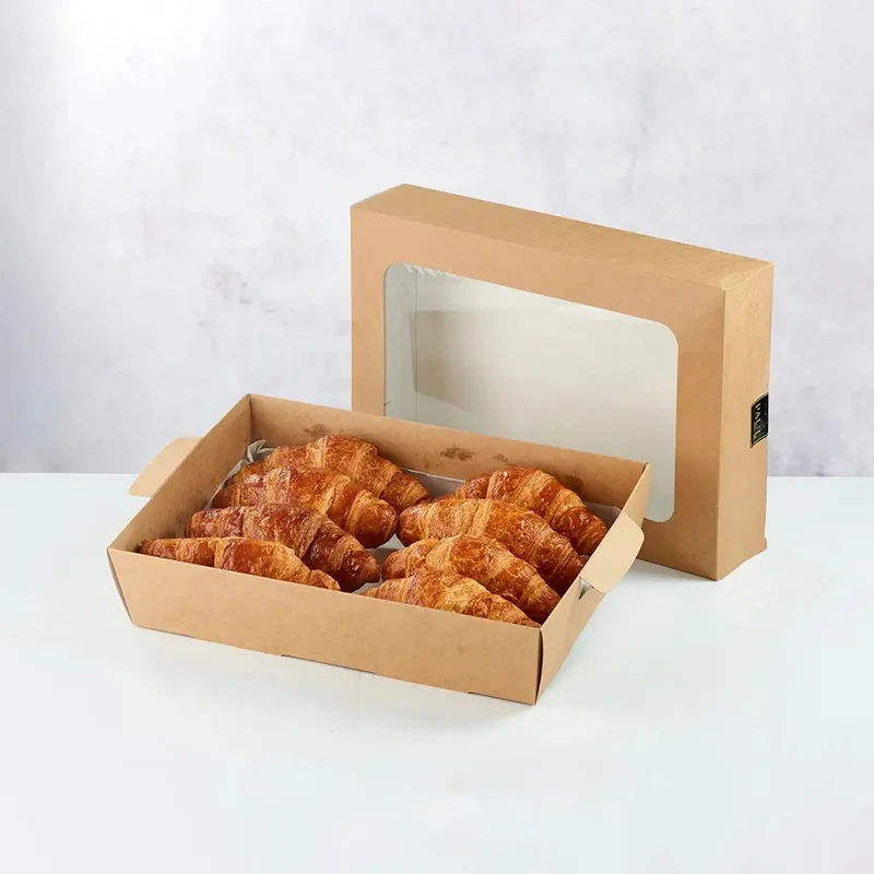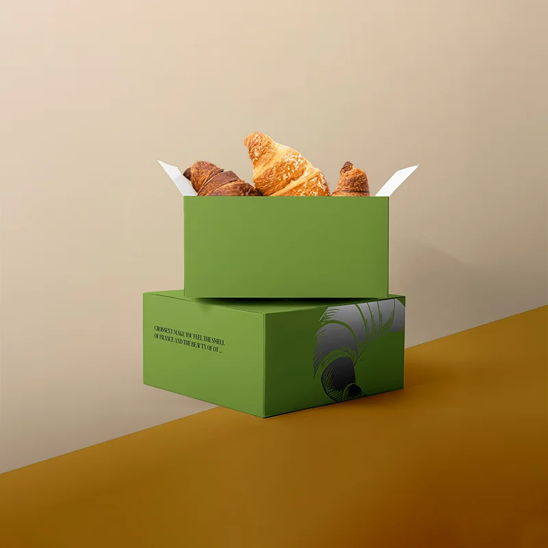 Croissant packaging is made from cardboard, kraft paper, or other materials to protect the flaky pastry from being crushed. These packaging boxes amplify the visual appeal at every stage. You can use these boxes for bakeries, online stores, and much more.